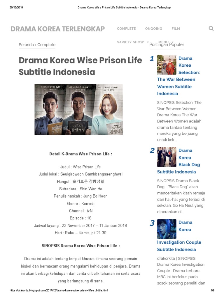Setting drama korea Wise Prison Life ini sendiri akan memakai latar penjara. Sinopsis Drama Korea Prison Playbook Serial Prison Playbook akan menfokuskan pada cerita yang berkisar di kehidupan sebuah penjara baik tahanan maupun para petugas staff keamanan dalam penjara tersebut. Subtitles for Prison playbook found in search results bellow can have various languages and frame rate result.